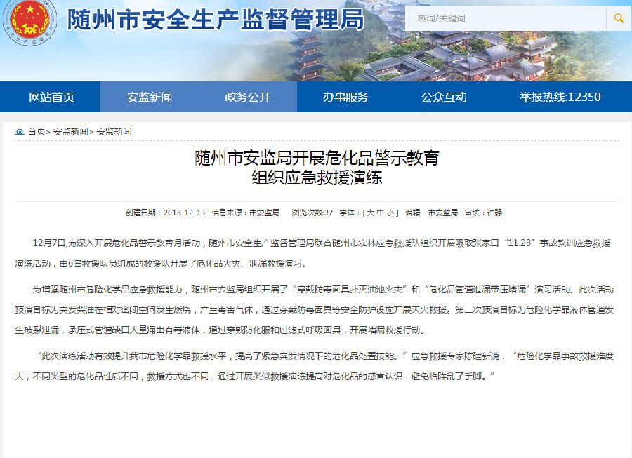 12月7日,为深入开展危化品警示教育月活动,随州市安全生产监督管理局联合随州市宏林应急救援队组织开展吸取张家口“11.28”事故教训应急救援演练活动,由6名救援队员组成的救援队开展了危化品火灾、泄漏救援演习。