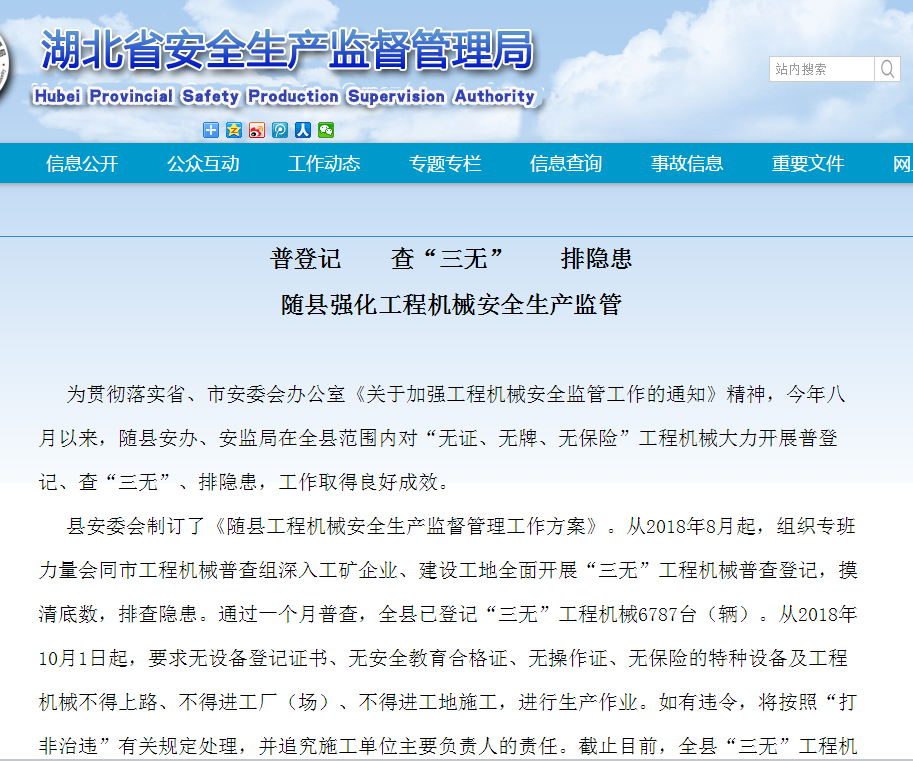 为贯彻落实省、市安委会办公室《关于加强工程机械安全监管工作的通知》精神,今年八月以来,随县安办、安监局在全县范围内对“无证、无牌、无保险”工程机械大力开展普登记、查“三无”、排隐患,工作取得良好成效。
