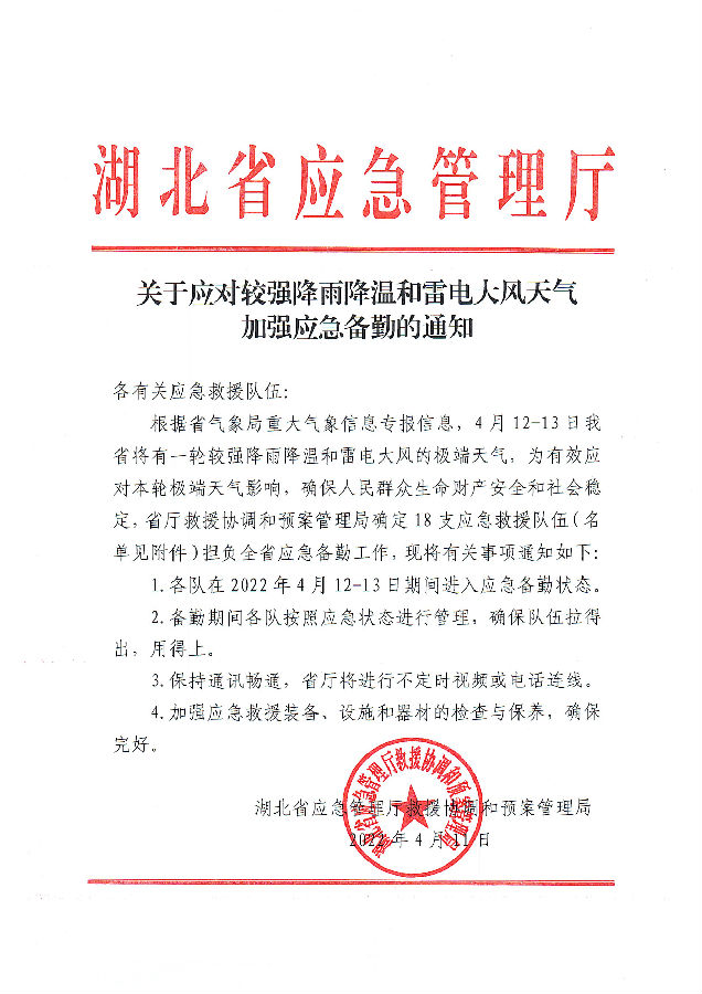 关于应对较强降雨降温和雷电大风天气加强应急备勤的通知